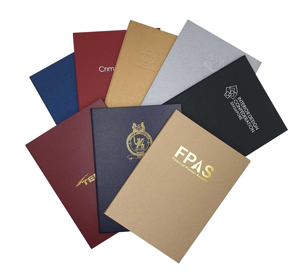 No standard size, fully customised and many option design layout to choose from. From paper base folder to leather type finishing. Customise logo emboss and foil printing is our speciality.
